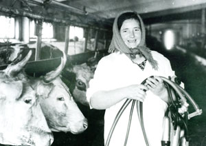 В 1941 году зерновые посевы в районе увеличились до 38400 гектаров. Только одной яровой пшеницы сеялось более 22 тыс. гектаров, сахарной свеклы — 1700. В период военных лет посевная площадь значительно сократилась. Посев яровой пшеницы составлял только около 13 тыс. гектаров, а всего под зерновыми было занято 23800 гектаров, под сахарной свеклой — 900. И лишь только после окончания войны в колхозы и совхозы стали поступать трактора и другие машины. Зерновой и кормовой клин расширялся заметно с каждым годом. И уже в 1967 году площадь, занимаемая зерновыми культурами, составляла в районе 63 тыс. гектаров. В 1935 году, в первые годы коллективизиации, крупного рогатого скота в районе было всего 1350 голов, свиней — 630, овец — 1500. Это по 1-3 головы на одно хозяйство. Перед войной поголовье скота сильно увеличилось, а в период военных лет несколько сократилось. В послевоенный период стал наблюдаться резкий рост. В 1967 году крупного рогатого скота уже имелось около 16 тыс. голов. Только одних дойных коров насчитывалось почти 10 тысяч голов, 9900 — свиней. (На снимке: Л.Т. Григорьева, доярка совхоза «Центральный», 1981 год.).Есть…